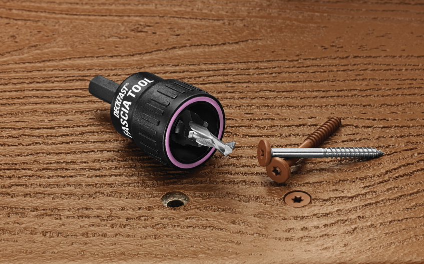 The Deckfast Fascia System comprises a special Fascia Tool and color-coated Headcote® stainless steel or epoxy-coated carbon steel Fascia Screws. The Fascia Tool has a pre-set countersink; pre-drilling with the tool creates an oversized hole that will allow the board to float on the screw to better accommodate expansion and contraction. Once the hole is predrilled, drive the Fascia Screw, which is color-matched specifically to all Envision composite decking colors.